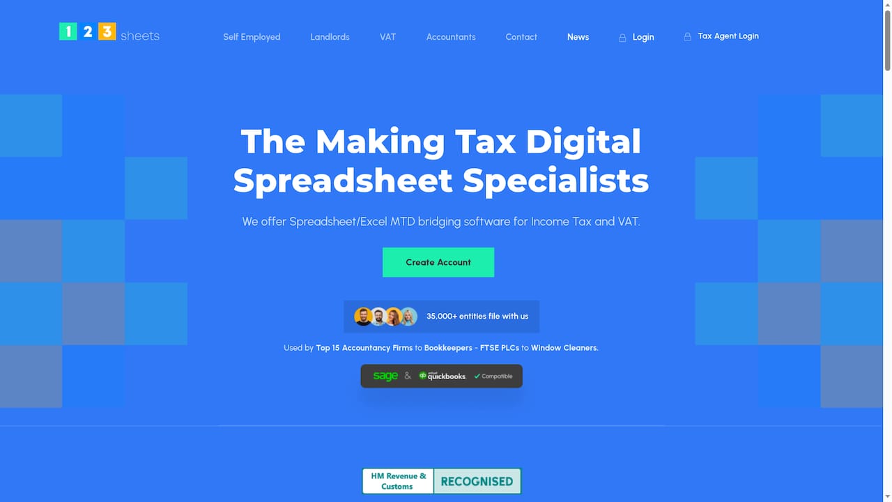 123 Sheets is a spreadsheet based MTD bridging solution that lets accountants and small businesses file VAT and Income Tax directly from familiar spreadsheets. It is HMRC recognised and aimed at users who prefer Excel or similar tools over full accounting packages.